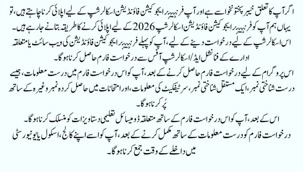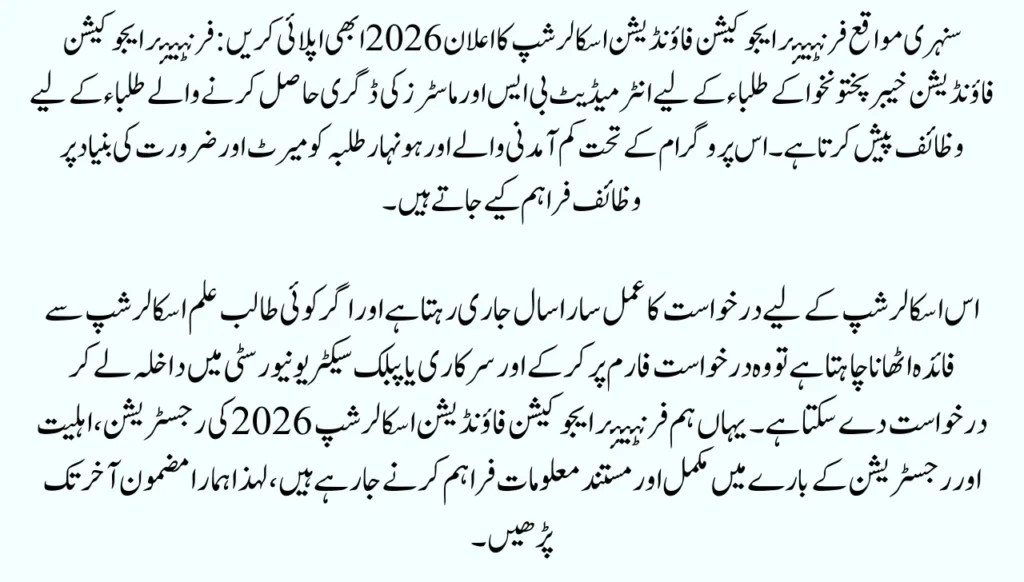 The application process for this scholarship continues throughout the year, and if any student wants to benefit from the scholarship, he can apply by completing the application form and taking admission government or public sector university. Here we are going to provide complete and authentic information about the registration, eligibility, and registration of Frontier Education Foundation Scholarship 2026, so read our article till the end.